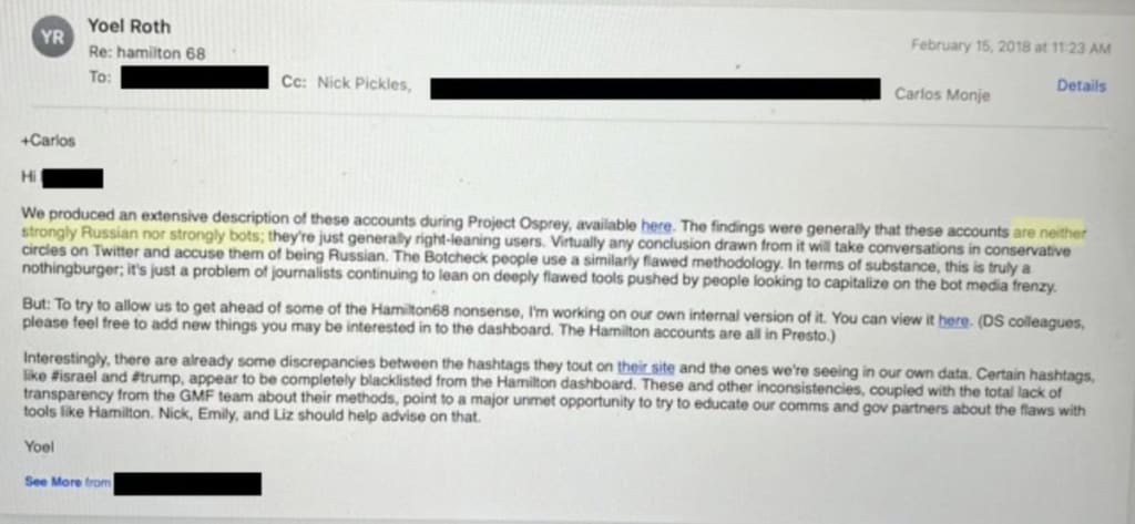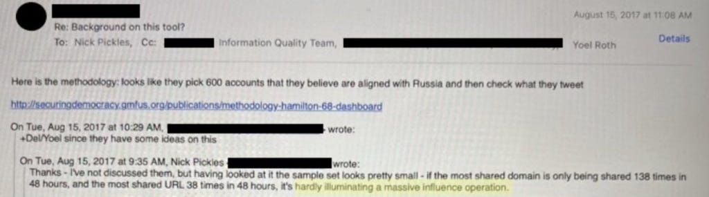 Tämä ei ollut virheellistä tiedettä. Tämä oli petos. Sen sijaan, että olisi seurattu, miten ”Venäjä” vaikutti amerikkalaisten asenteisiin, Hamilton 68 yksinkertaisesti keräsi kourallisen enimmäkseen todellisia ja enimmäkseen amerikkalaisia käyttäjätilejä. Sitten se vain kuvaili niiden orgaanisia keskusteluja venäläisten juonitteluksi. Kuten [Twitterin Yoel] Roth asian ilmaisi: ”Käytännössä kaikissa [käyttöliittymän] perusteella tehdyissä johtopäätöksissä on vain otettu konservatiivisten piirien keskusteluita Twitterissä ja syytetty niitä venäläisiksi.”