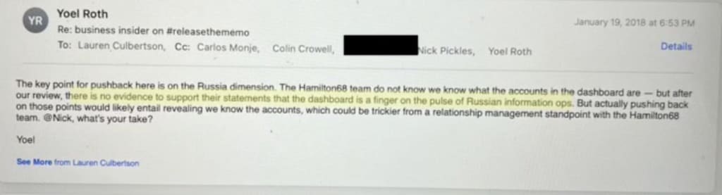 Twitterin kunniaksi on todettava, että alustalla ei nielty Hamilton 68:n väitteitä aivan purematta. Twitterin johtoporras alkoi kyseenalaistaa Hamiltonin väitteitä ja vaikka järjestö ei suostunutkaan julkaisemaan listaansa, Twitterin työntekijöillä oli mahdollisuus rekonstruoida lista Hamiltonin sivustolta juontavien Twitterille lähetettyjen tietopyyntöjen pohjalta. Näin myös tehtiin. Twitterläisten reaktio paljastukseen oli vähintäänkin ällistynyt: