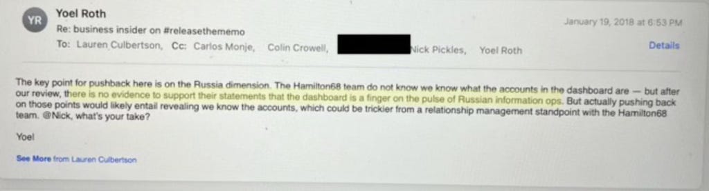 Twitterin Yoel Roth – siitä huolimatta, että hän useimpien Twitterin päällystöön kuuluvien tavoin oli selkeästi poliittisesti vasemmalla – piti hamilton 68:n logiikkaa alentavana.